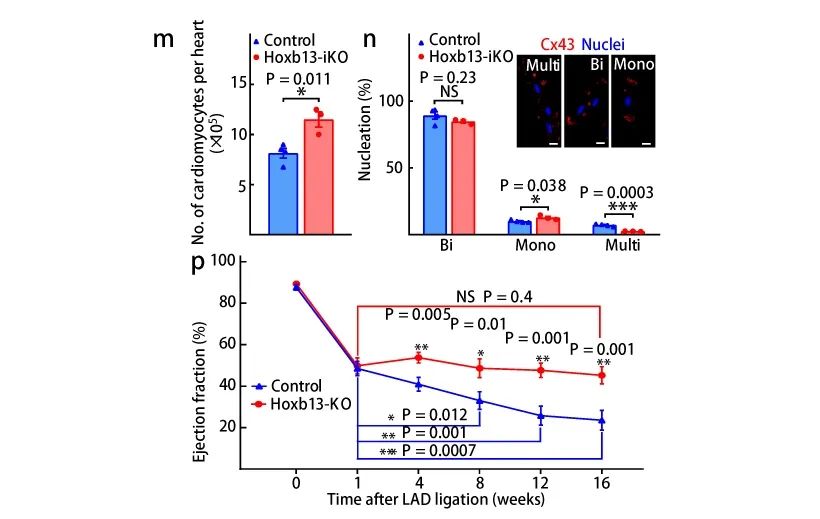 除此之外,成年 Hoxb13-KO 小鼠中诱导了心肌梗死 (MI),发现 Hoxb13 的敲除可以防止 LVEF 的下降,但是左心室收缩功能并没有改善。总的来说,Hoxb13 的缺失可预防 MI 后收缩功能的逐步恶化,但不会引起实质性功能恢复。