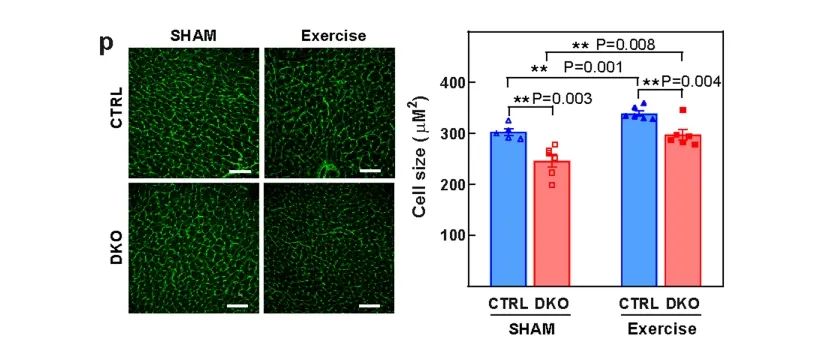 Meis1-Hoxb13 的缺失,即 DKO 小鼠心脏中发现了心脏再生的一些特征,如心肌细胞肌小节分解,单核心肌细胞增加。并且观察到成年小鼠中心肌细胞的增殖也很活跃。他们再进行了进一步的研究,以评估 Meis1 和 Hoxb13 缺失对心肌肥大的影响,发现 DKO 心脏表现出运动诱发的生理性肥厚反应减弱。