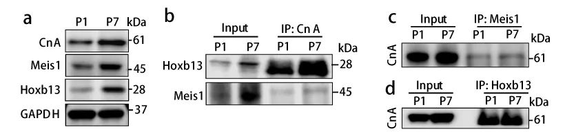 蛋白免疫印迹 (WB) / 免疫共沉淀 (Co-IP) 结果显示 (蛋白提取过程中别忘了使用蛋白酶和磷酸酶抑制剂来保护它们哟,戳一戳,MCE 官网直接可申请 蛋白酶抑制剂 、 磷酸酶抑制剂 Cocktail 试用装哦!) ,与 Meis1 和 Hoxb13 相似,P7 时钙调神经磷酸酶的催化亚基 CnA 的蛋白水平升高,并且这三种蛋白相互作用。扫描 Calcineurin 对接基序结果表明,Calcineurin 与 Hoxb13 直接相互作用,并可能将它去磷酸化。进一步地,他们找到了作用位点 S204,Calcineurin 依赖性的 Hoxb13S204 去磷酸化作用促进了Hoxb13 的核转运,并促进了细胞周期的阻滞。