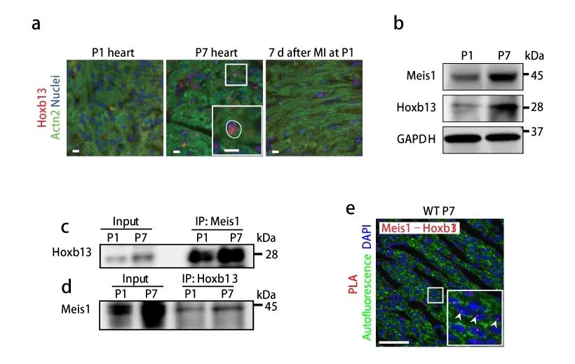 此前的研究中,Sadek 的研究团队已经发现 Hox 蛋白家族与 Meis1 有紧密联系。在这次的研究中,通过在心脏损伤后进行再修复的 7 天内 (P1-P7) 检测 Hoxb13 蛋白家族的表达发现,Hoxb13 是再生后心肌细胞中与 Meis1 相互作用的转录因子。