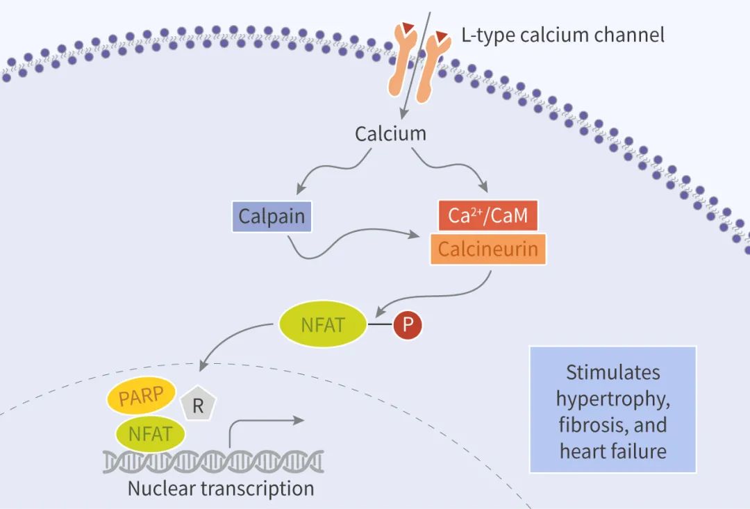 Calcineurin:钙调神经磷酸酶,细胞质中一种 Ca2+/CaM (钙调蛋白) 依赖性蛋白磷酸酶。当 Calcineurin 被钙激活时,通过其下游转录效应因子 NFAT (活化 T 细胞核因子) 介导肥厚反应,NFAT 直接被 Calcineurin 去磷酸化并发生核转位。