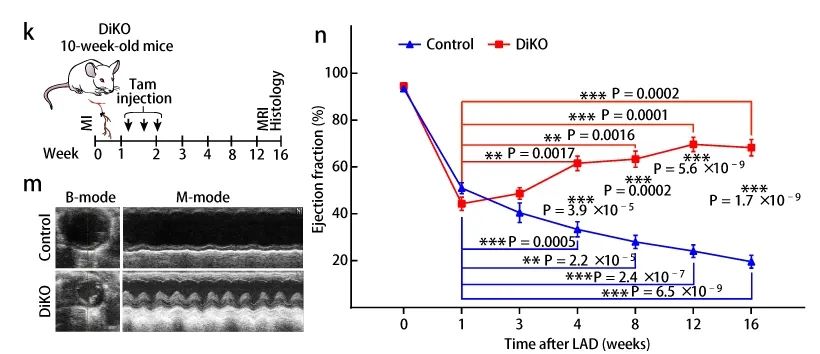 为了检测心肌细胞增殖水平增加是否有助于成年心脏的修复,对 DiKO 小鼠进行 MI 干预,结果表明,Meis1 和 Hoxb13 的缺失诱导心肌细胞增殖,可以改善 MI 后的左心室收缩功能。